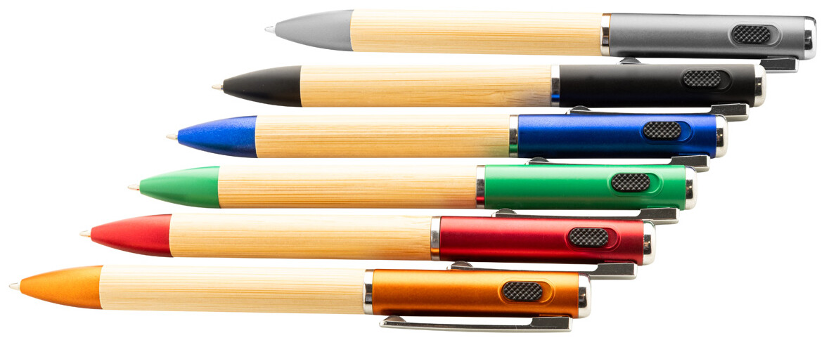 Kuličkové pero z bambusu a recyklovaného ABS plastu s 1 LED svítilnou. S modrou náplní a knoflíkovou baterií.