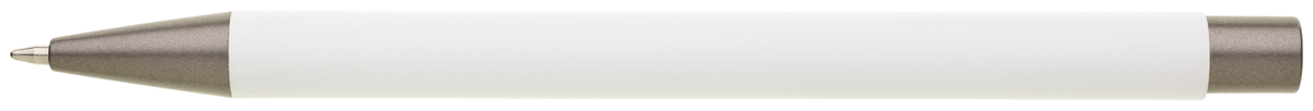 Kovová propiska CAGERI SOFT s hnědo-černými doplňky, s bílým pogumovaným povrchem. Velkoobsahová modrá náplň. Na bílém povrchu propisky jsou místy drobné tečky.