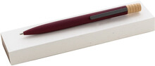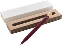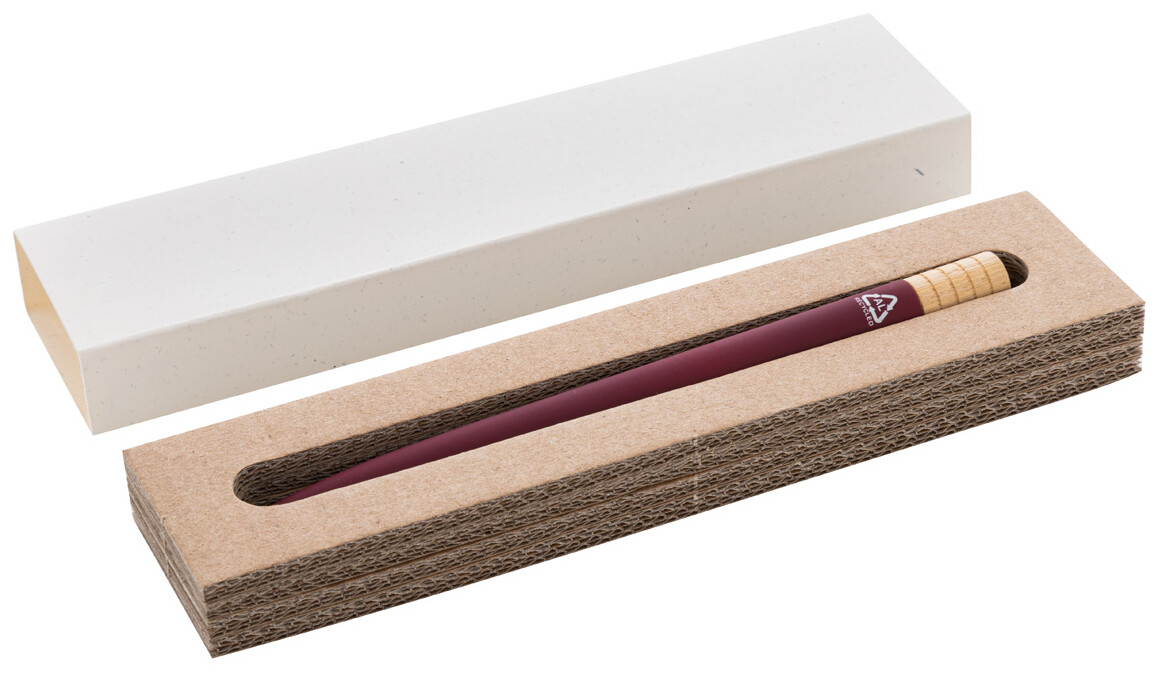 Kuličkové pero z recyklovaného hliníku s kovovým klipem a bambusovým vrškem. S modrou náplní. V kraftové papírové krabičce.
