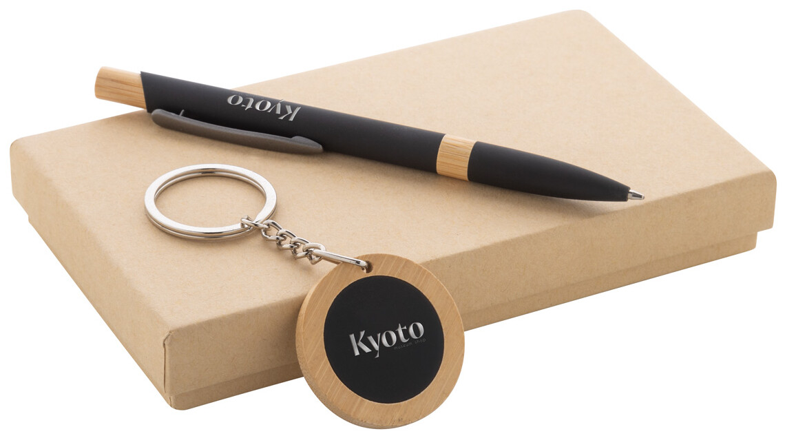 2dílná dárková sada v dárkové krabičce z kraftového papíru. Včetně kuličkového pera z recyklovaného hliníku s bambusovými detaily, pogumovaným povrchem a modrou náplní a bambusového kroužku na klíče s pogumovaným povrchem z recyklované nerezové oceli. Obě položky mají speciální povrchovou úpravu pro zrcadlové laserové gravírování.