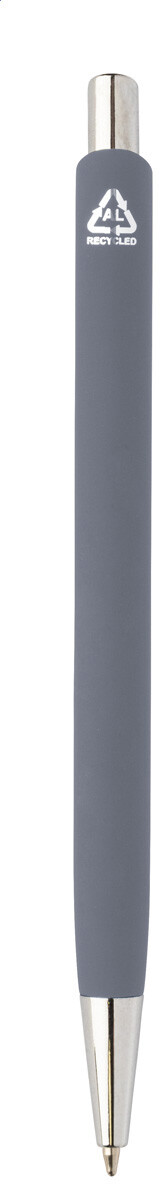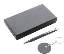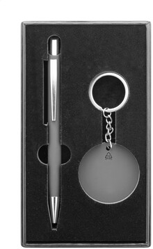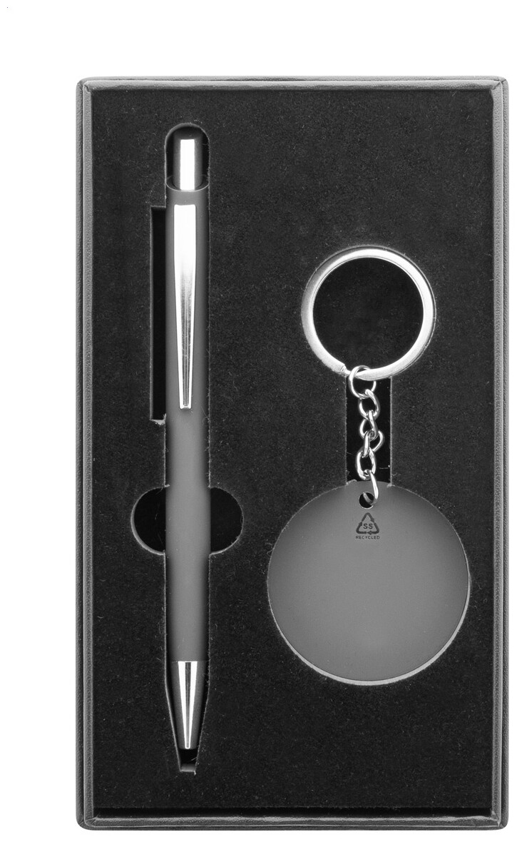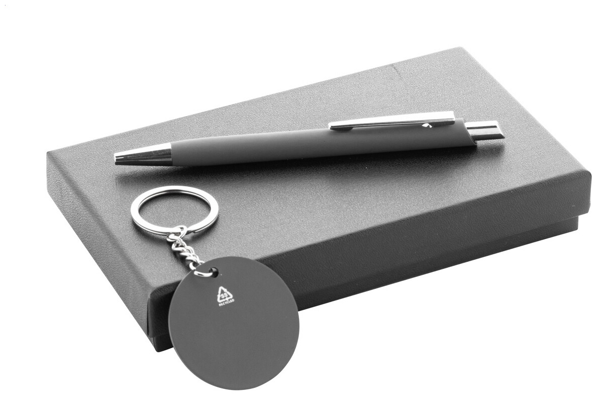 2dílná dárková sada v černé papírové dárkové krabičce. Včetně kuličkového pera z recyklovaného hliníku s pogumovaným povrchem a modrou náplní a přívěsku na klíče z recyklované nerezové oceli s pogumovaným povrchem. Obě položky mají speciální povrchovou úpravu pro zrcadlové laserové gravírování.