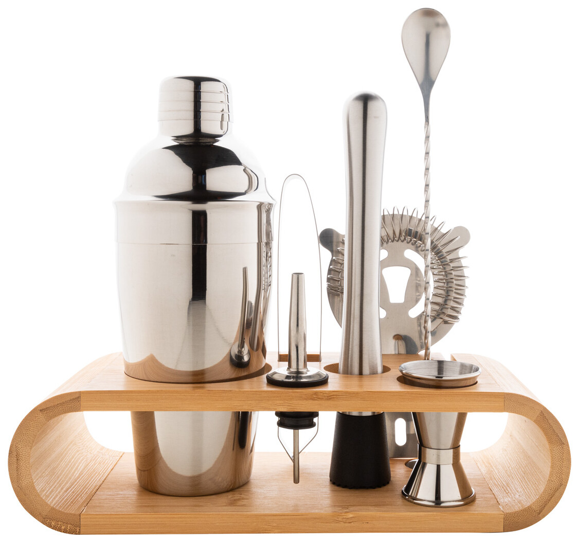 7dílná sada na koktejly z nerezové oceli v bambusovém stojanu. Obsahuje: šejkr na koktejly (550 ml), odměrku, sítko, barovou lžičku, drtič, kleště na led a nálevku.