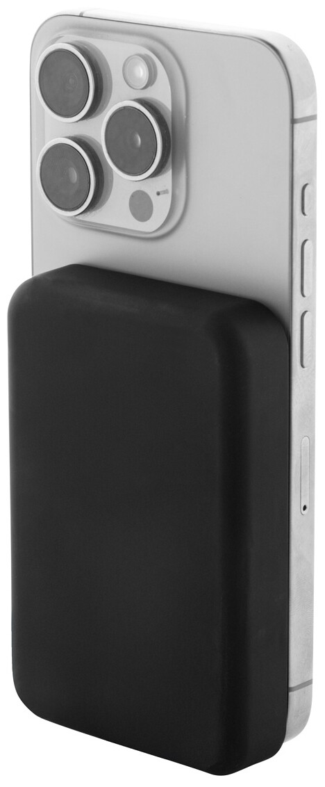 Power banka z recyklovaného ABS s 5000 mAh baterií a vestavěnou magnetickou bezdrátovou nabíječkou (5W). Se vstupem USB-C a portem pro nabíječku. Včetně samolepícího kovového kroužku pro použití magnetické funkce na jakémkoli bezdrátově nabíjecím zařízení. Kompatibilní s iPhone® 12 nebo novějším. Včetně USB nabíjecího kabelu.