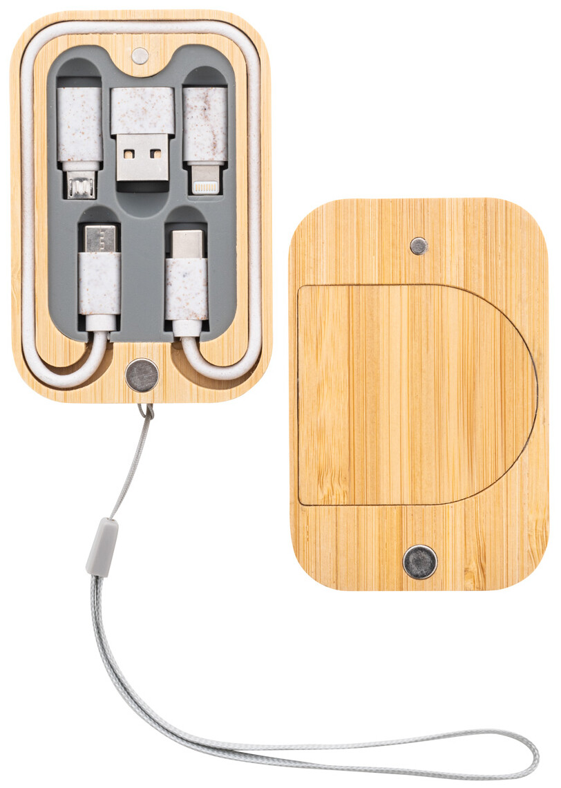 Ekologická sada USB nabíjecího kabelu z pšeničné slámy a bezdrátové rychlonabíječky (15W) v magnetickém bambusovém pouzdře s popruhem. Včetně kabelu USB-C s adaptéry USB, micro USB a Lightning.