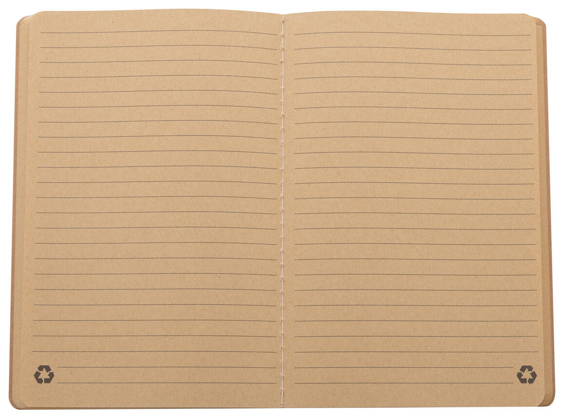 Blok A5 potažený recyklovaným papírem se šitými deskami a 60 linkovanými listy z recyklovaného kraftového papíru.