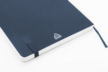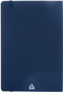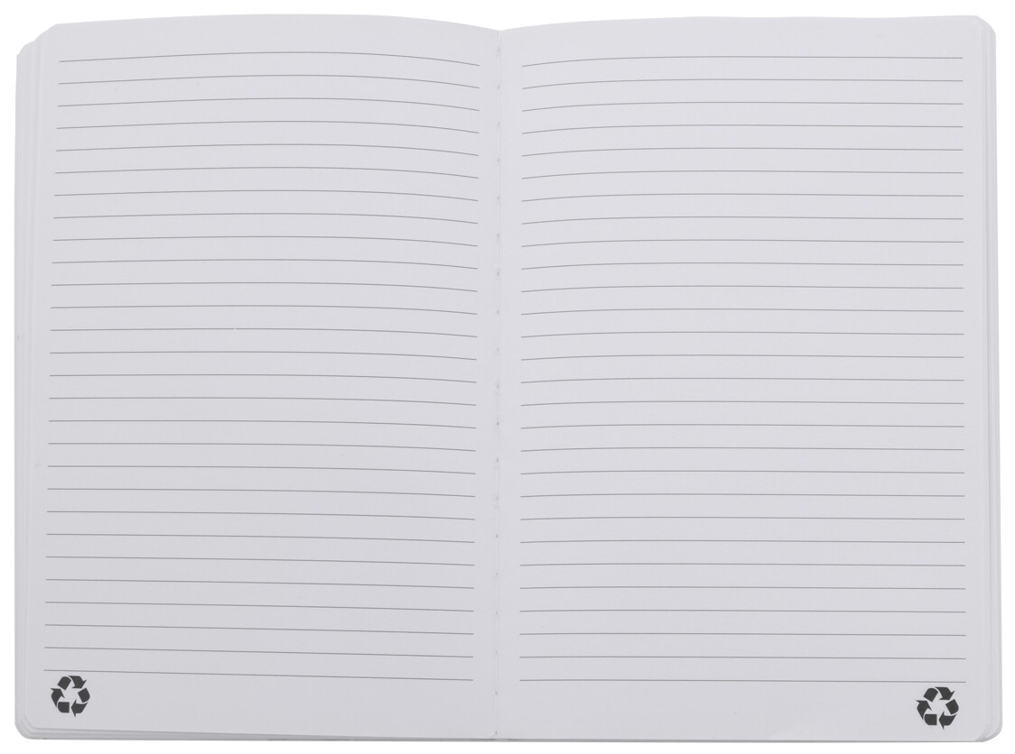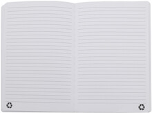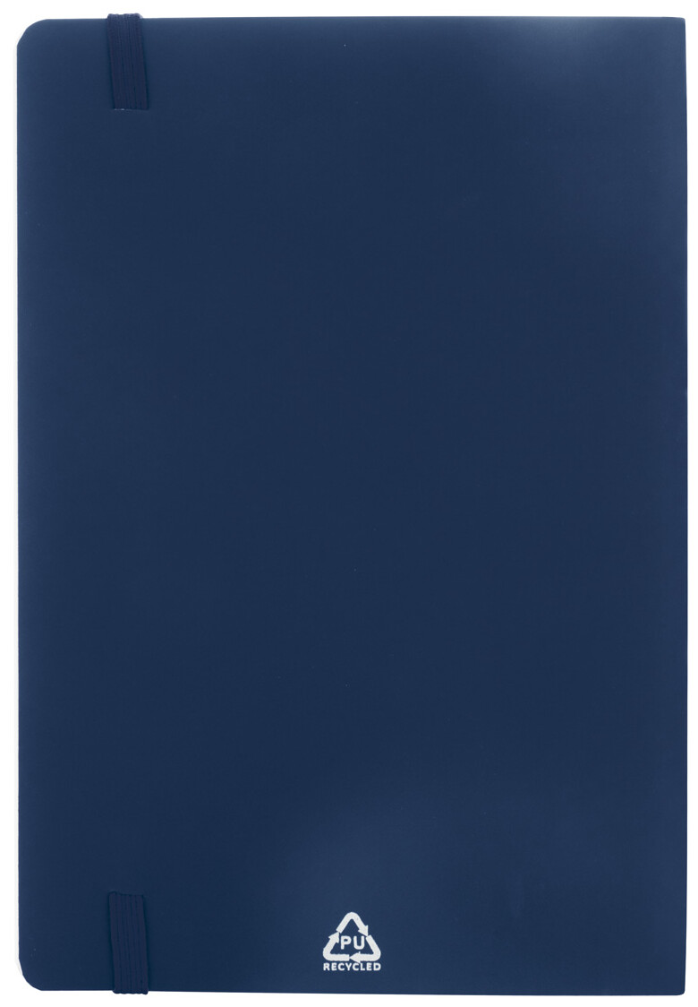 Blok A5 z recyklované PU kůže s měkkou vazbou s 80 linkovanými listy z recyklovaného papíru. Se záložkou v odpovídající barvě a gumičkou.