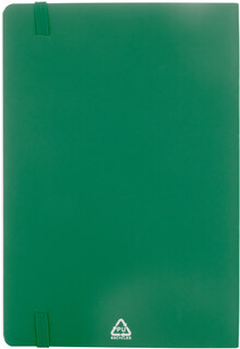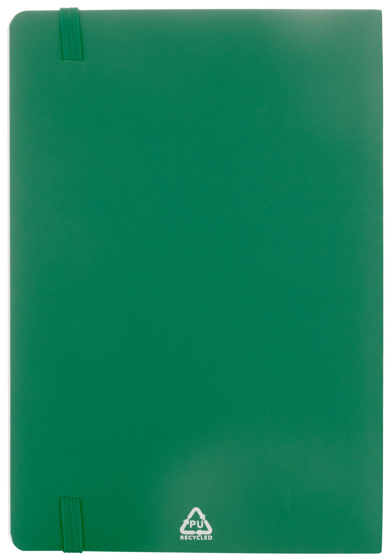 Blok A5 z recyklované PU kůže s měkkou vazbou s 80 linkovanými listy z recyklovaného papíru. Se záložkou v odpovídající barvě a gumičkou.