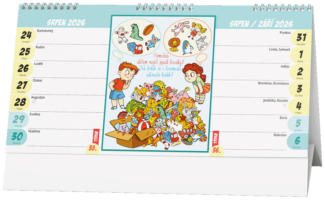 Stolní kalendář s týdenním kalendáriem, při kterém se žádné dítě nenudí - s obrázky, úkoly a bludišti.