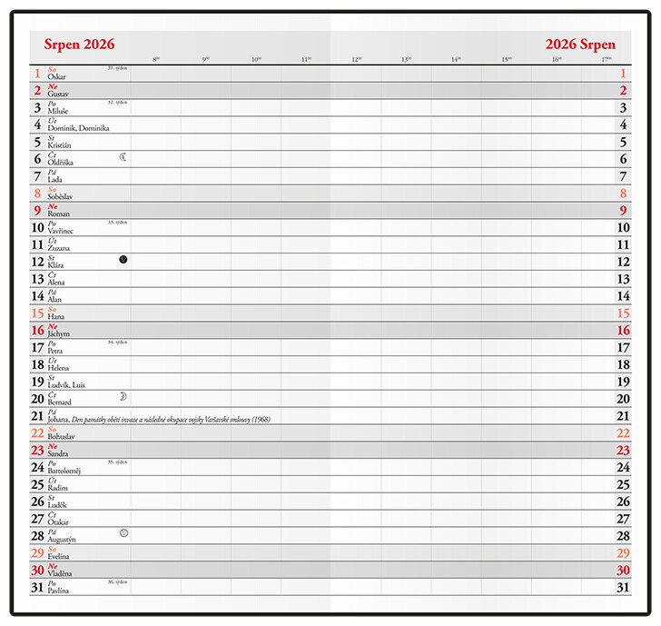 - osobní záznamy, jmenný seznam, roční plánovací kalendář aktuálního roku, tabulkový kalendář následujícího a aktuálního roku, přehled státních a ostatních svátků ČR, místo na poznámky