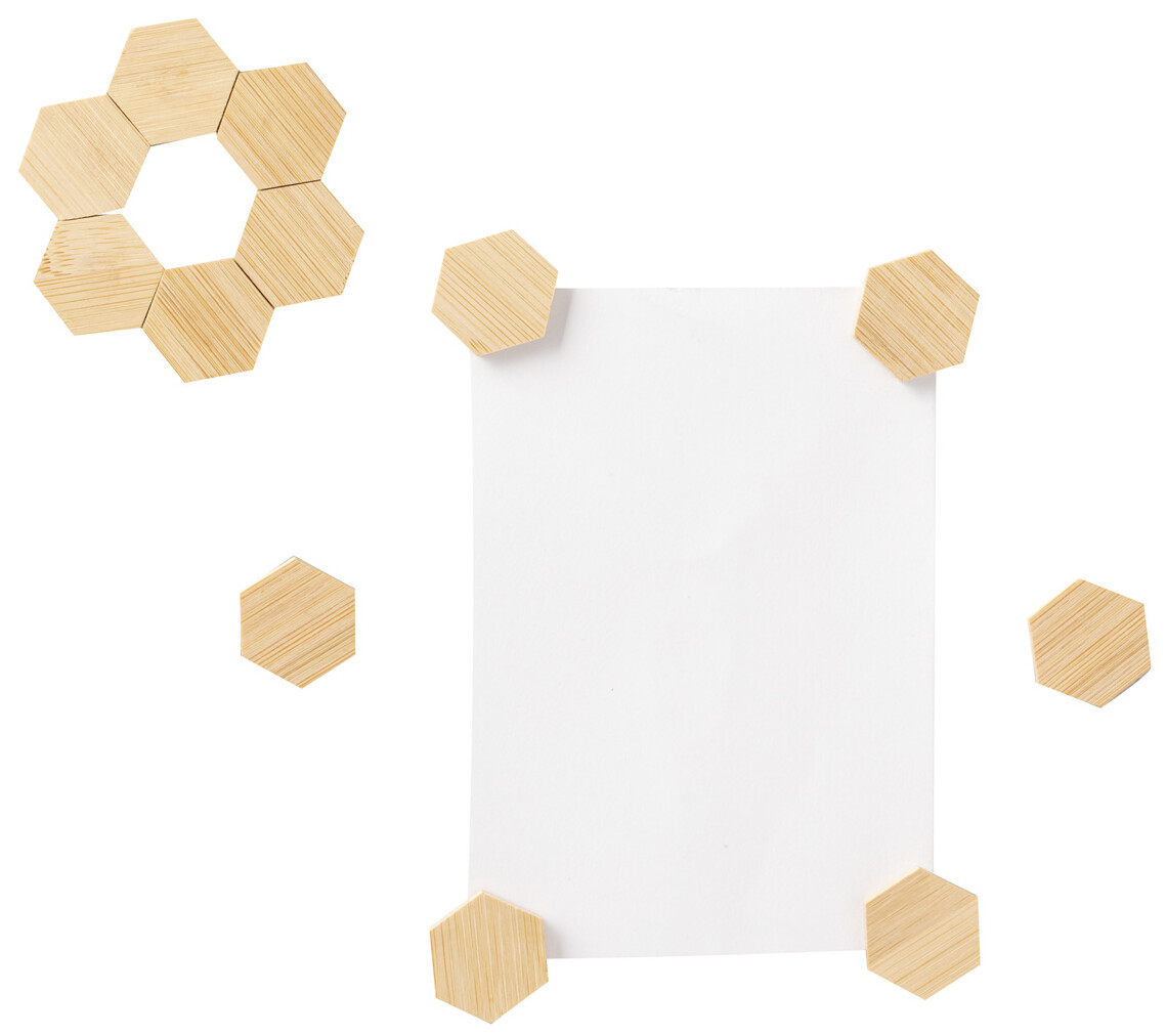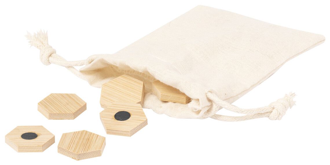 12dílná sada bambusových magnetů na ledničku, v bavlněném pytlíku se stahovací šňůrkou.