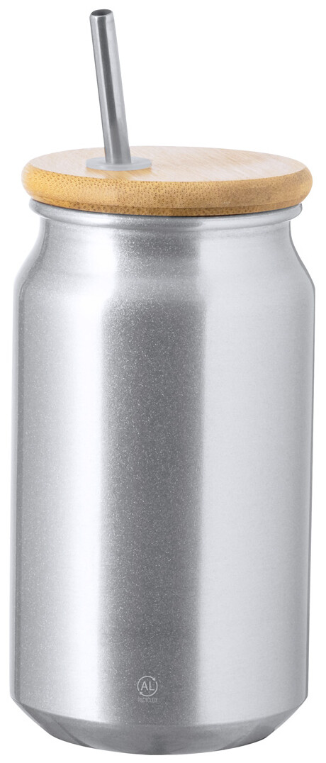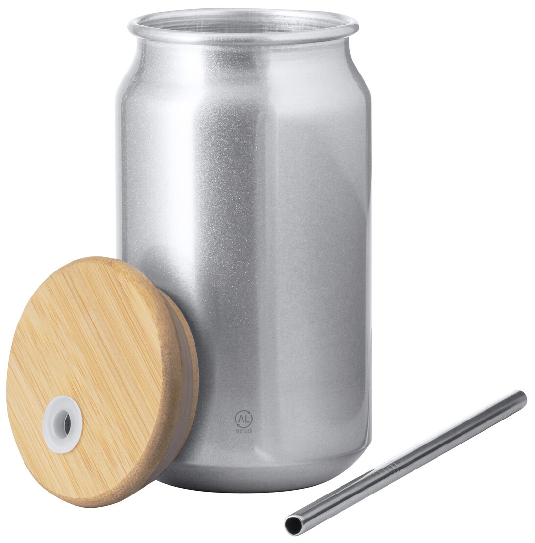 Pohár z recyklovaného hliníku s bambusovým víčkem a nerezovým brčkem na pití, 430 ml. V kraftové papírové krabici.