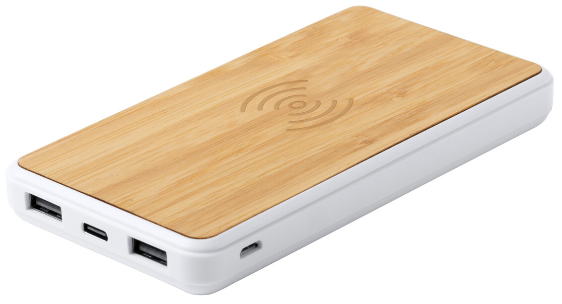 USB power banka s bambusem s 8000 mAh baterií a vestavěnou bezdrátovou nabíječkou. Se 2 USB a 1 USB-C nabíjecími porty, přes které může být power banka nabíjena. Vč. micro USB nabíjecího kabelu.
