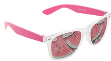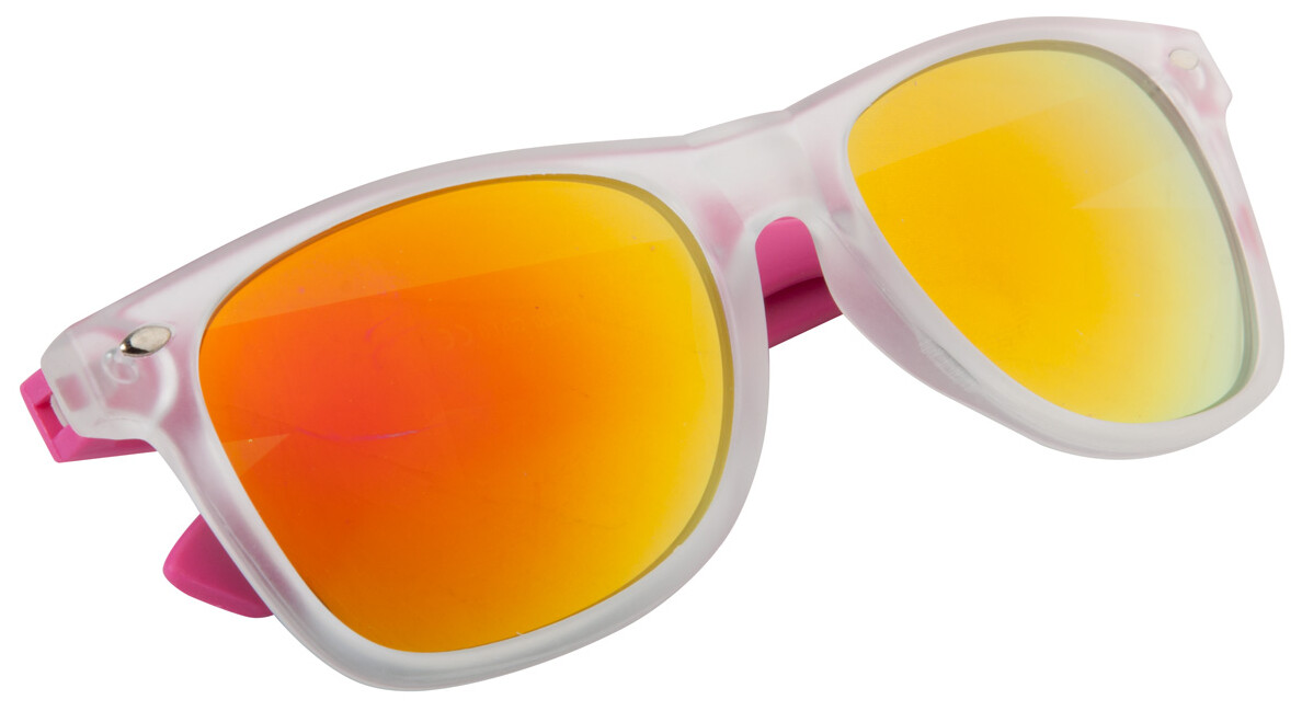 Plastové sluneční brýle s UV400 ochranou a matným povrchem. S transparentními obroučkami, barevnými nožičkami a barevně odpovídajícími metalickými čočkami.