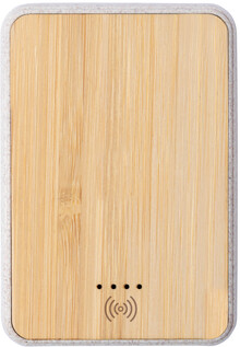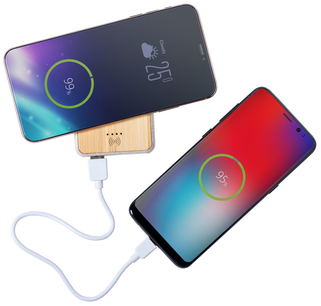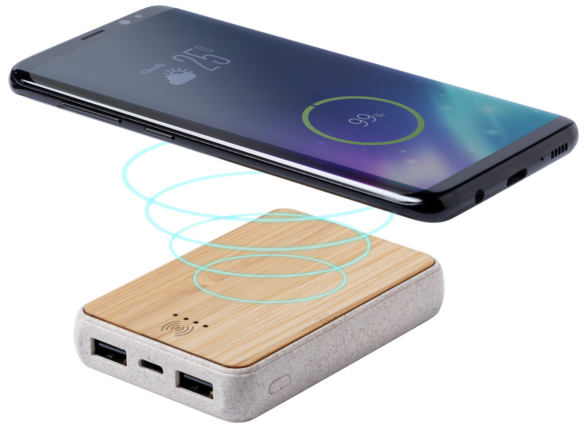 USB powerbanka s baterií 5 000 mAh z bambusu a plastu z pšeničné slámy s vestavěnou bezdrátovou nabíječkou. Se 2 USB nabíjecími porty. Powerbanku lze nabíjet přes port USB-C. Včetně USB nabíjecího kabelu.