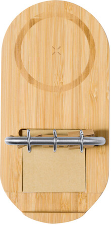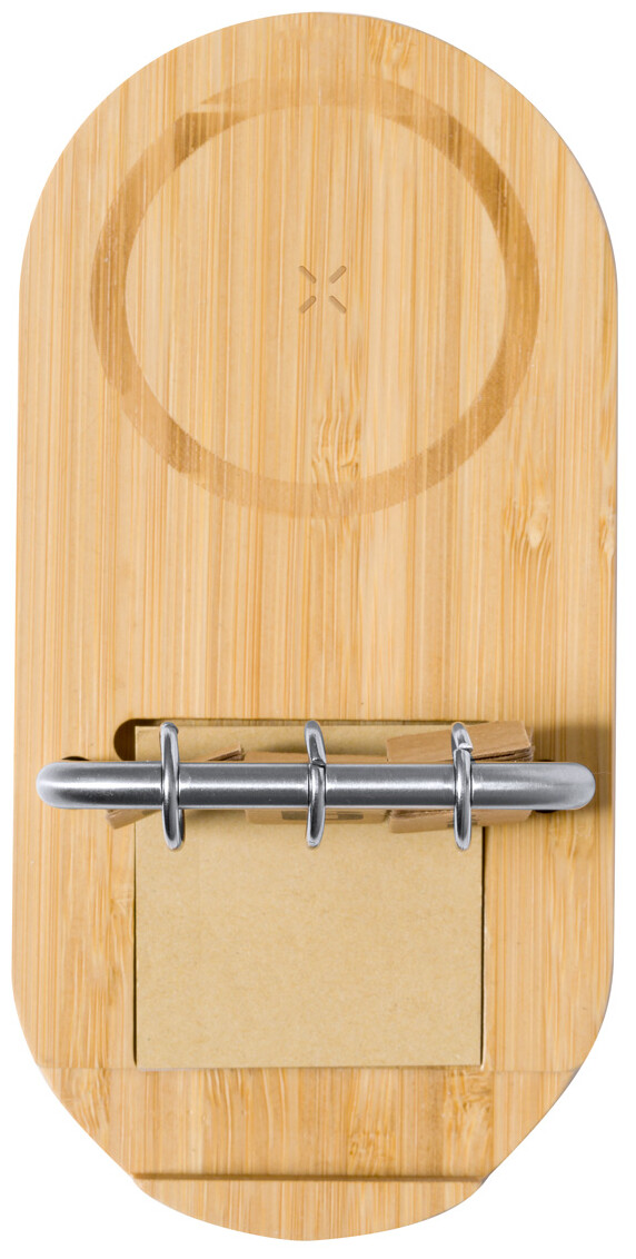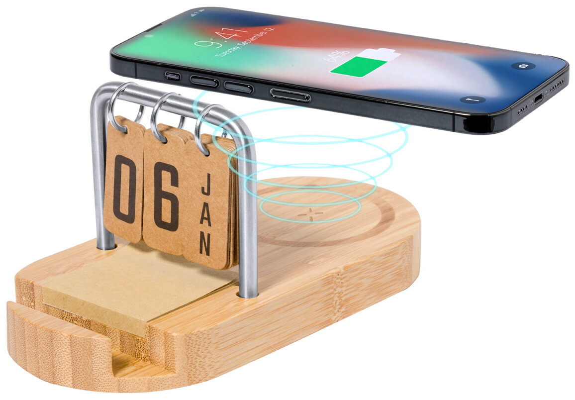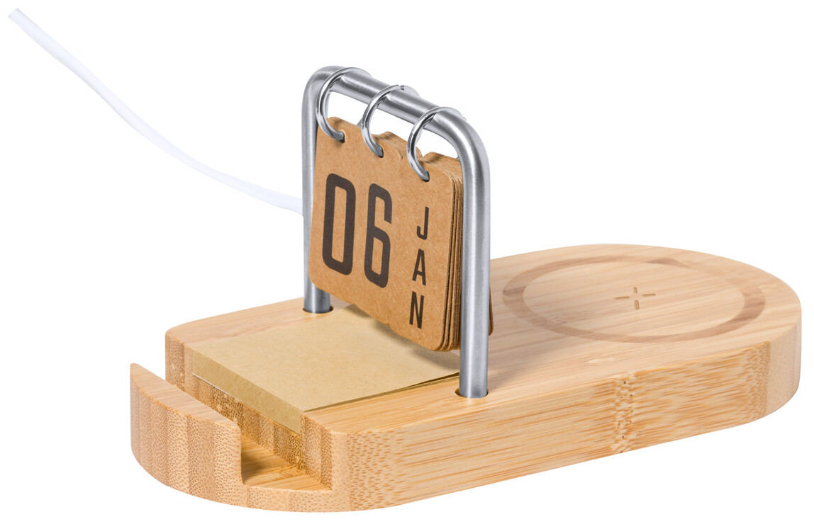 Bambusová, multifunkční bezdrátová rychlonabíječka (15W) s držákem na mobil a věčným kalendářem na kovovém rámu. S porty USB a USB-C pro nabíječku. Včetně 50 listů kraftových papírových lepících lístků a USB nabíjecího kabelu.