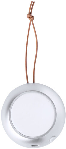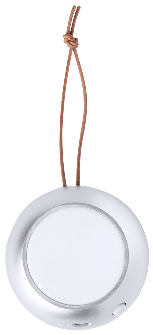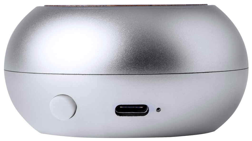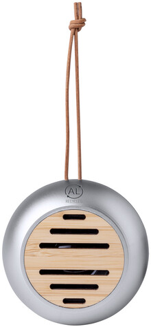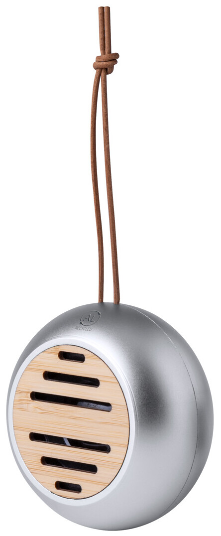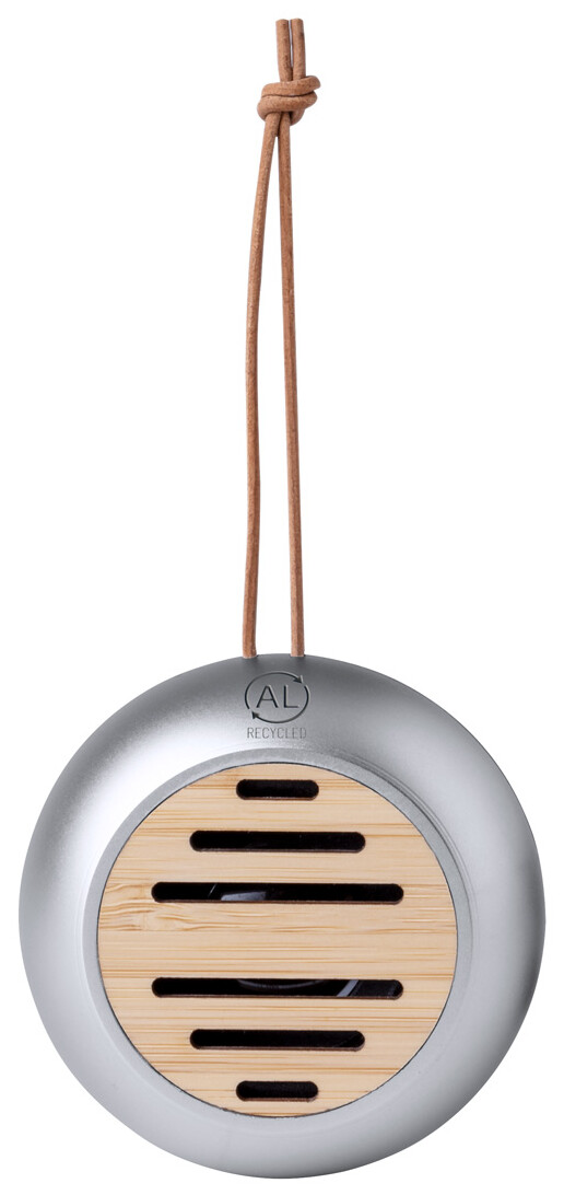 Bezdrátový reproduktor z recyklovaného hliníku s bambusovou síťovinou a popruhem z PU kůže. S vestavěnou dobíjecí baterií. Včetně nabíjecího kabelu USB.