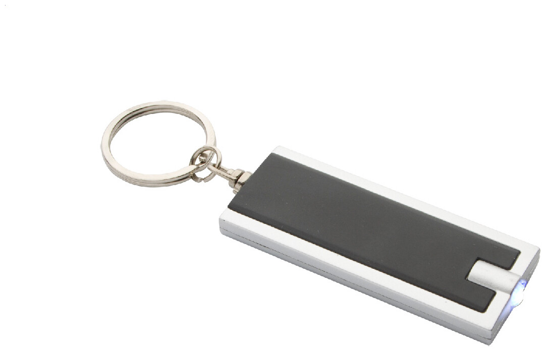 Přívěšek na klíče z recyklovaného ABS materiálu s LED svítilnou a kovovým kroužkem. S knoflíkovými bateriemi.