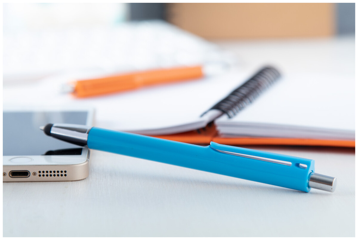 Plastové kuličkové a dotykové pero s modrou náplní.