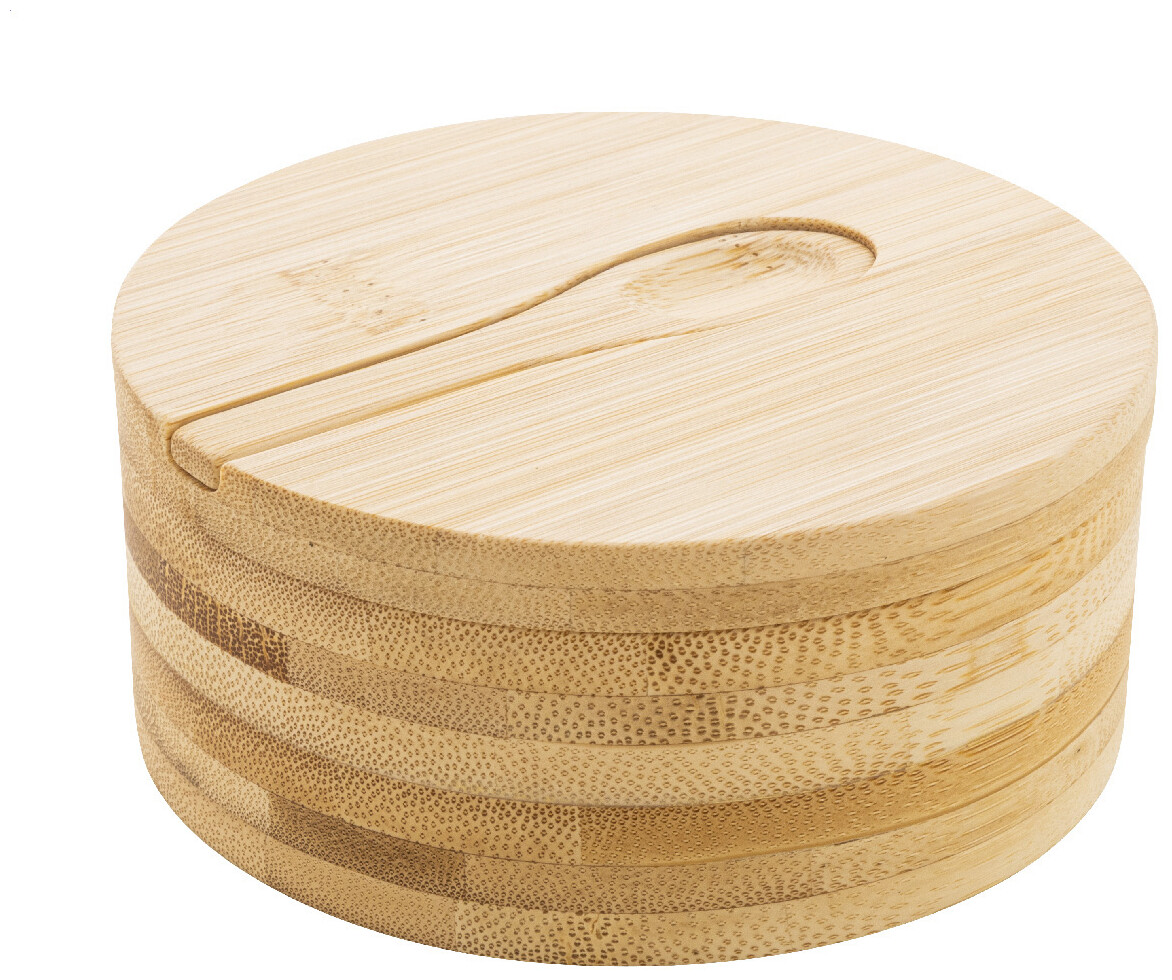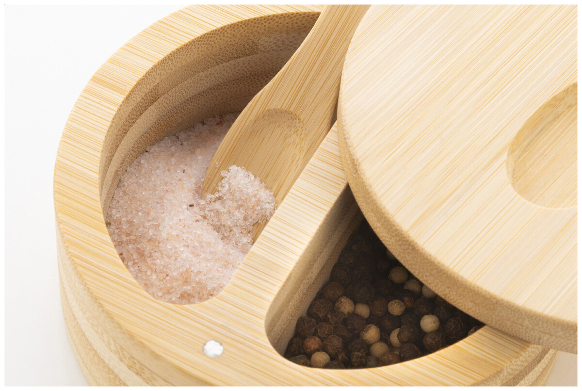 Bambusová slánka a pepřenka se dvěma přihrádkami a magnetickým otočným víkem. Včetně vestavěné servírovací lžíce.