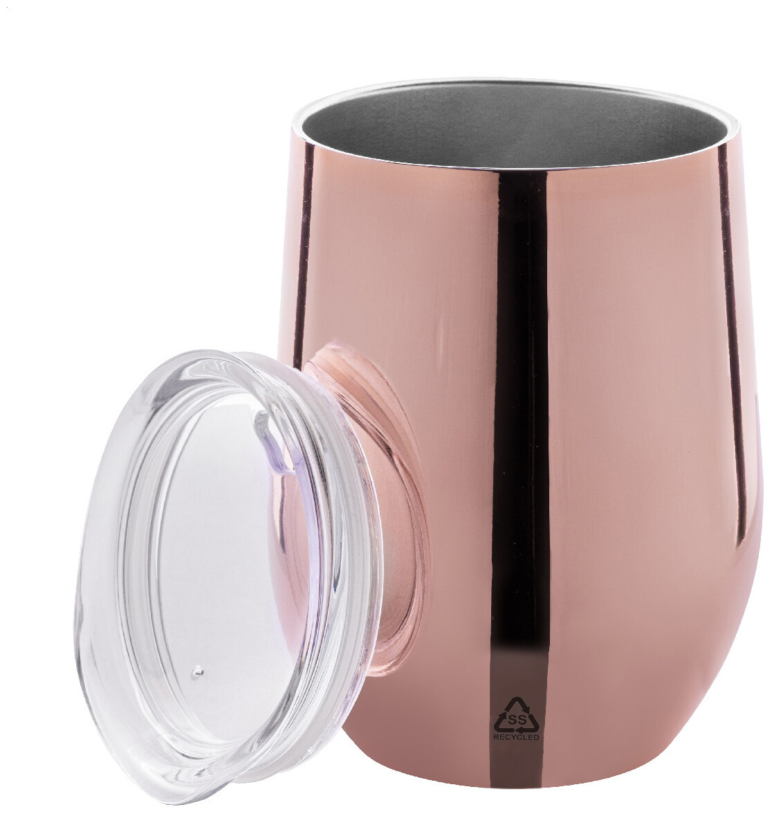 Dvoustěnný termohrnek z recyklované nerezové oceli s vysoce lesklou kovovou povrchovou úpravou a plastovým víčkem. 350 ml.