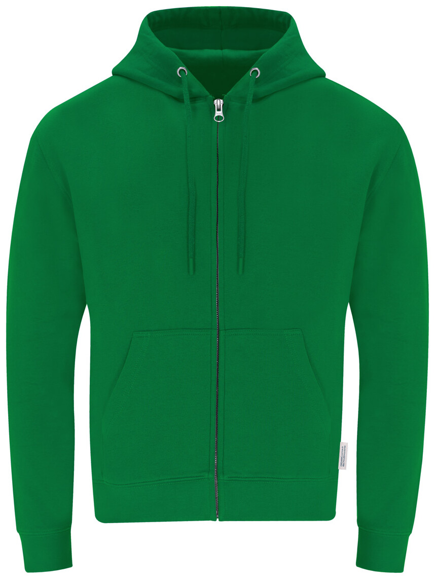 Mikina s kapucí na zip a předními kapsami ze 60% organické bavlny a 40% RPET polyesteru, 280 g/m2.