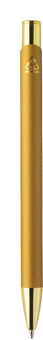 Kuličkové pero z recyklovaného hliníku s pogumovaným tělem a barevnými lesklými kovovými díly. Se speciálním povrchem pro zrcadlové gravírování, které odpovídá kovovým částem. S modrou náplní.