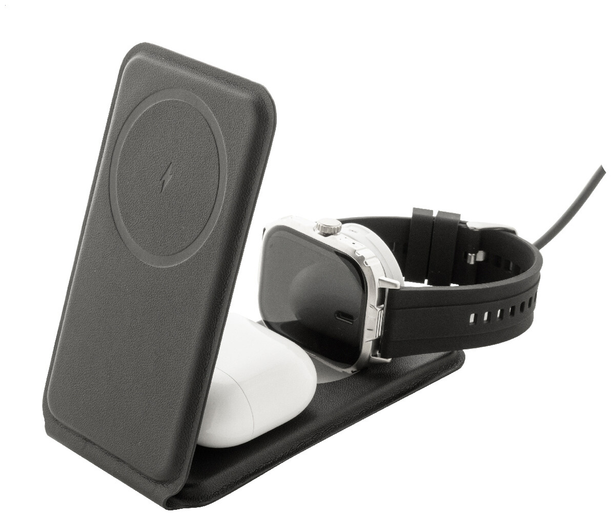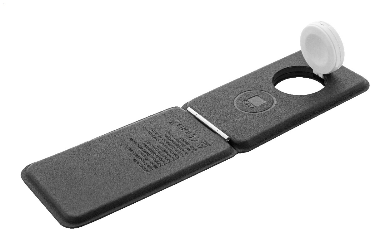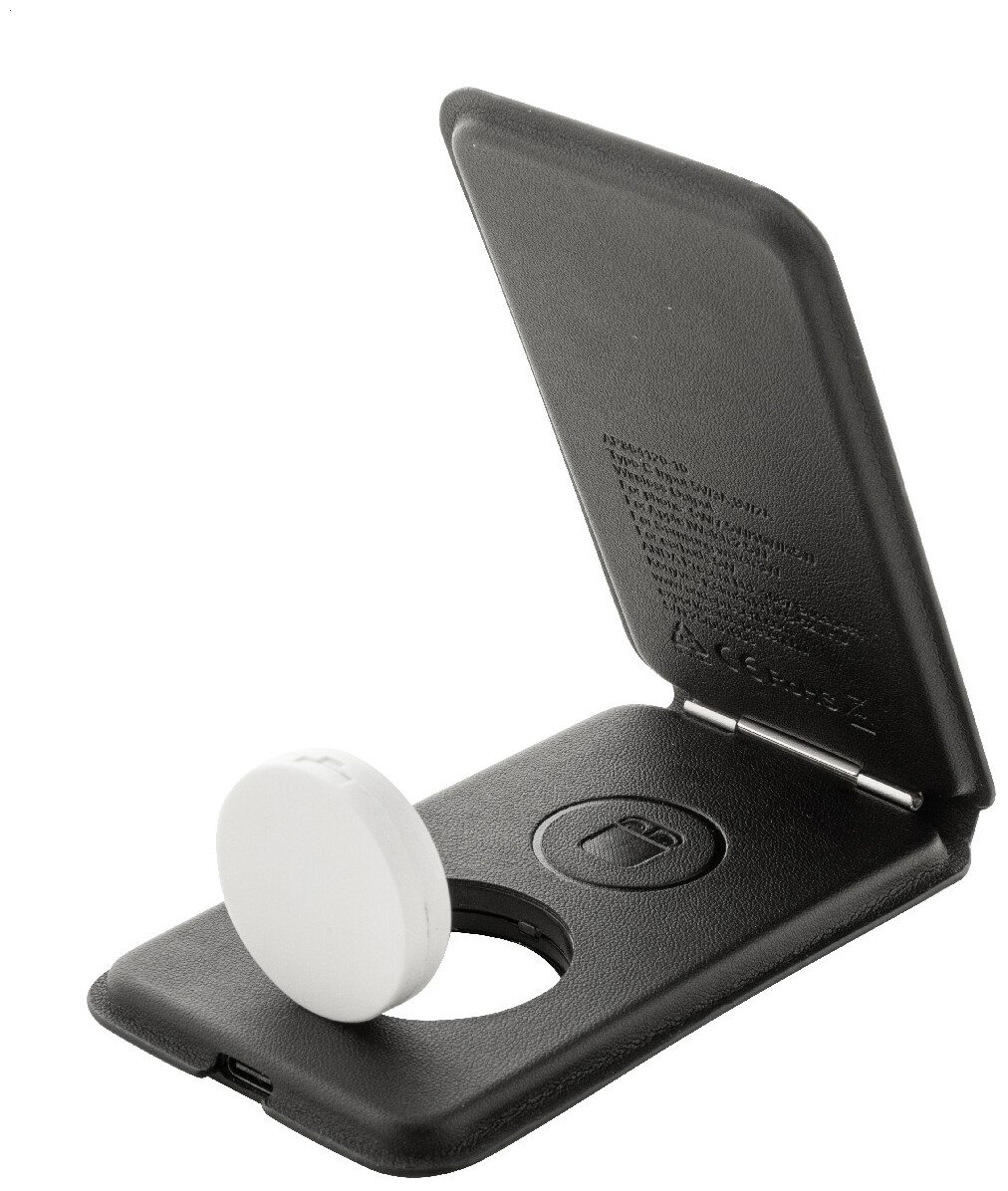 Luxusní skládací držák na mobilní telefon a bezdrátová nabíjecí sada z recyklované PU kůže. S magnetickou bezdrátovou rychlonabíječkou (15 W), bezdrátovou nabíječkou (5 W) pro sluchátka (pouze Apple®) a bezdrátovou nabíječkou (2,5 W) pro chytré hodinky (Apple® a Samsung®). Včetně samolepicího kovového kroužku pro použití magnetické funkce na jakémkoli bezdrátově nabíjecím zařízení. Kompatibilní s iPhone® 12 nebo novějším. Včetně USB nabíjecího kabelu.