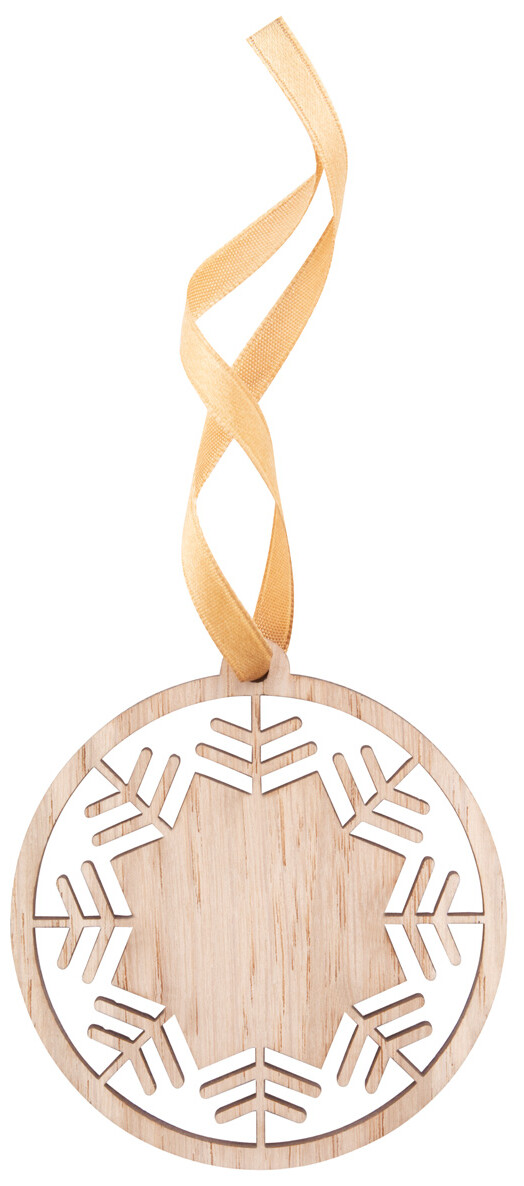 Vánoční ozdoba z dubové dýhy, dodáváno s oddělenou zlatou stužkou.