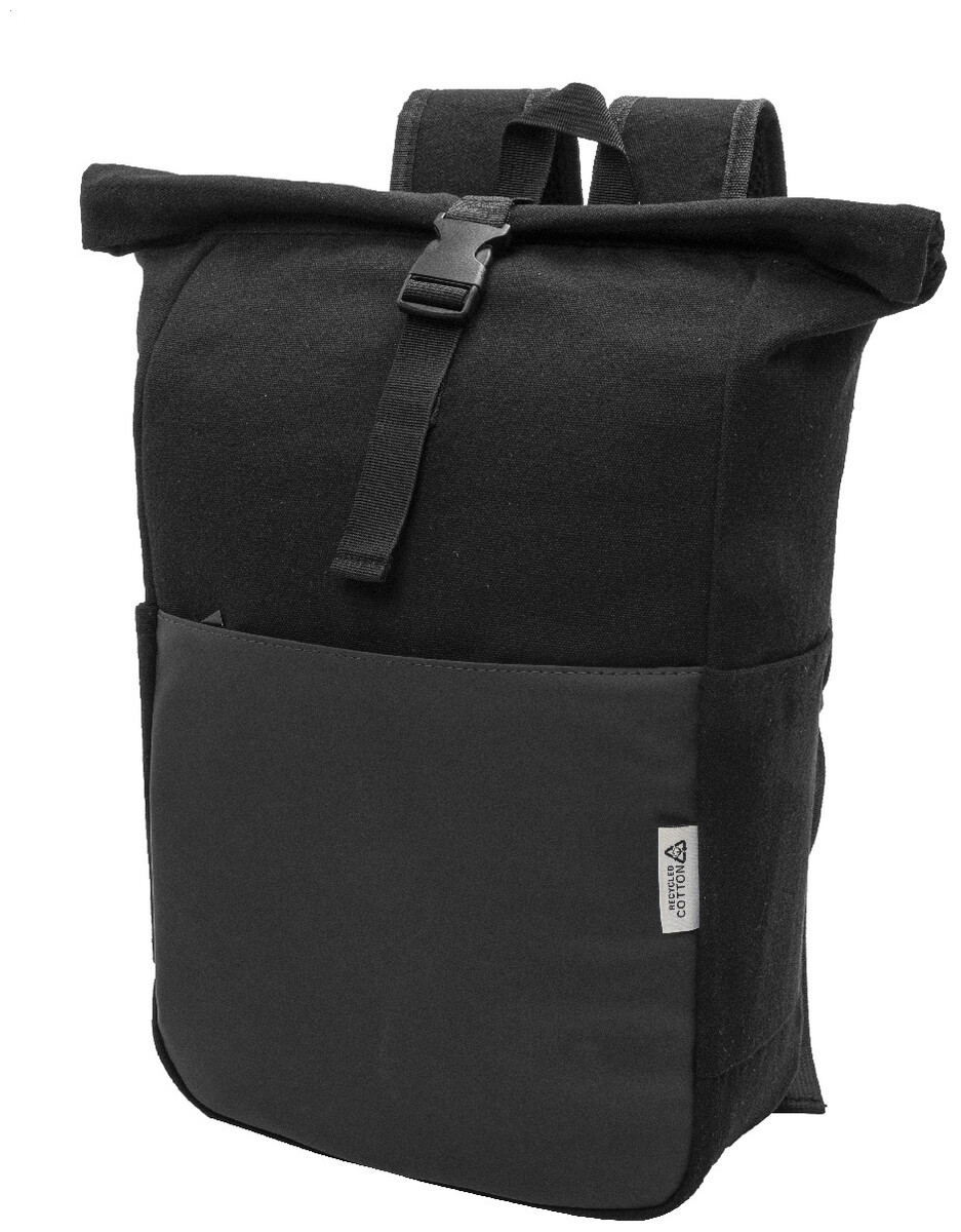 Rolovací batoh z recyklovaného plátna se zapínáním na přezku a přední kapsou na zip z měkké recyklované PU kůže. S polstrovanou přihrádkou na notebook (15"), bočními kapsami, polstrovanými zády a ramenními popruhy. 70% recyklované bavlny a 30% RPET polyesteru. S výrazným štítkem z recyklované bavlny.