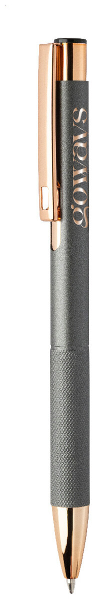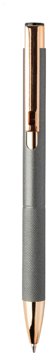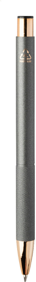 Kuličkové pero z recyklovaného hliníku s matným tělem, texturovaným úchopem a detaily růžového zlata. Se speciálním povrchem pro zrcadlové laserové gravírování v barvě růžového zlata. S modrou náplní.