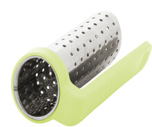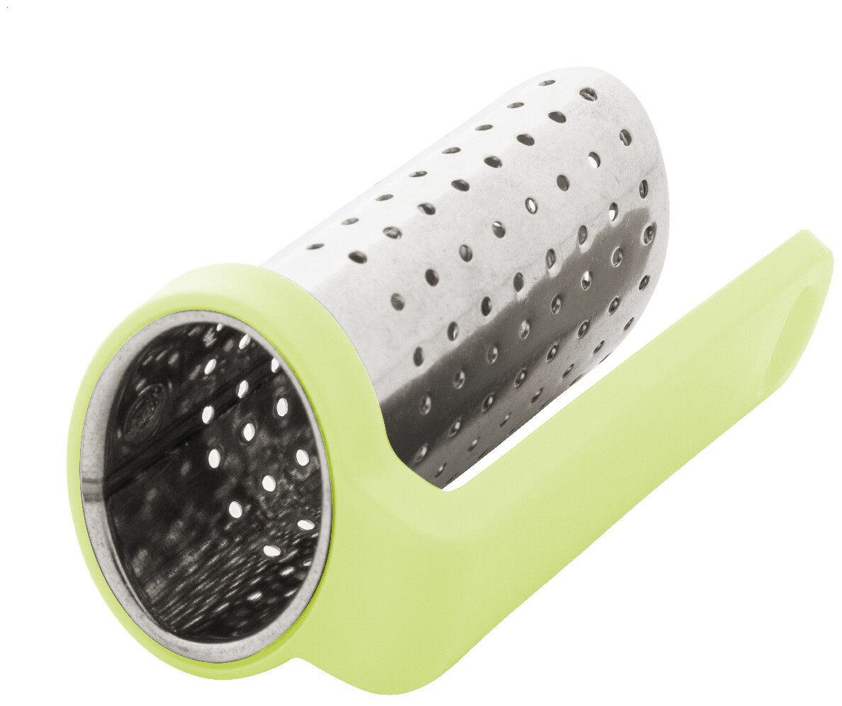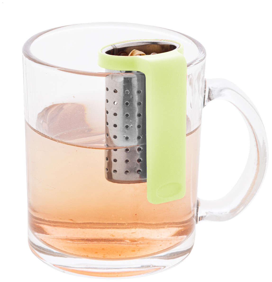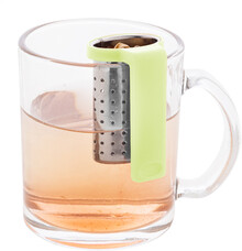 Nerezové sítko na čaj s praktickým klipem z recyklovaného ABS plastu. Navržen pro snadné připevnění k okraji hrnku.