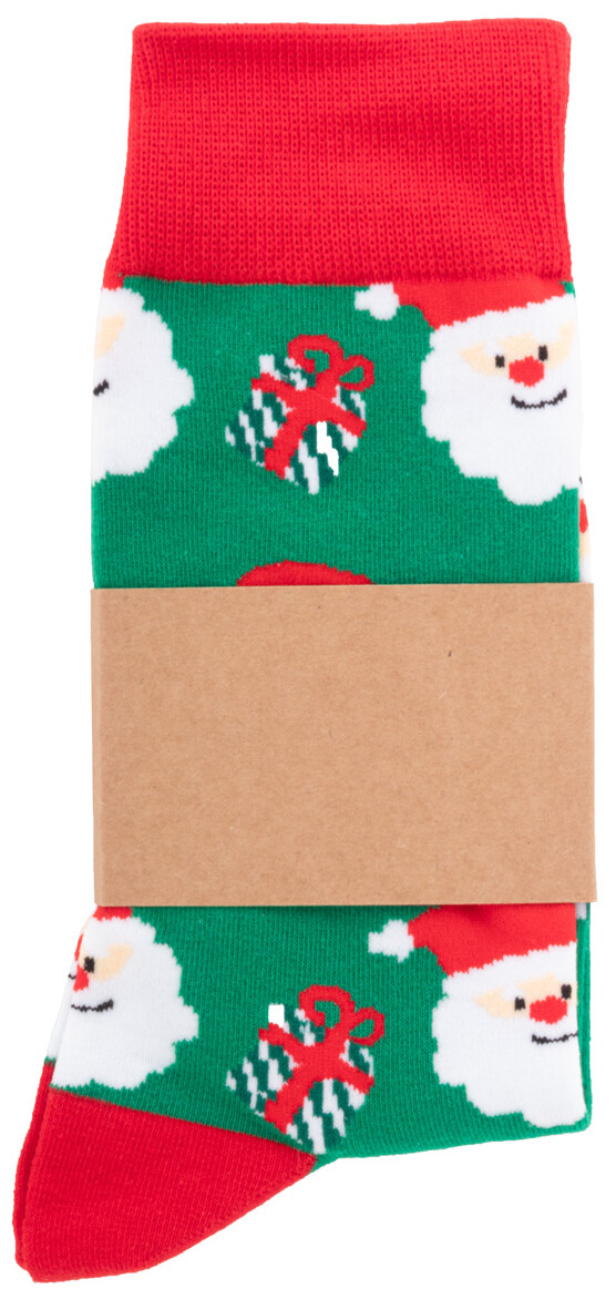 Pár vánočních ponožek ze 73 % bavlny, 25 % RPET polyesteru a 2 % spandexu. S potisknutelným sulfátovým papírem.
