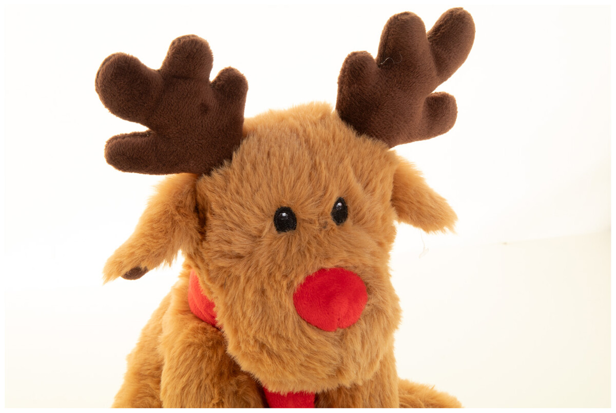 RPET plyšový vánoční sob se šálou. S tisknutelnou visačkou z kraftového papíru na uchu.