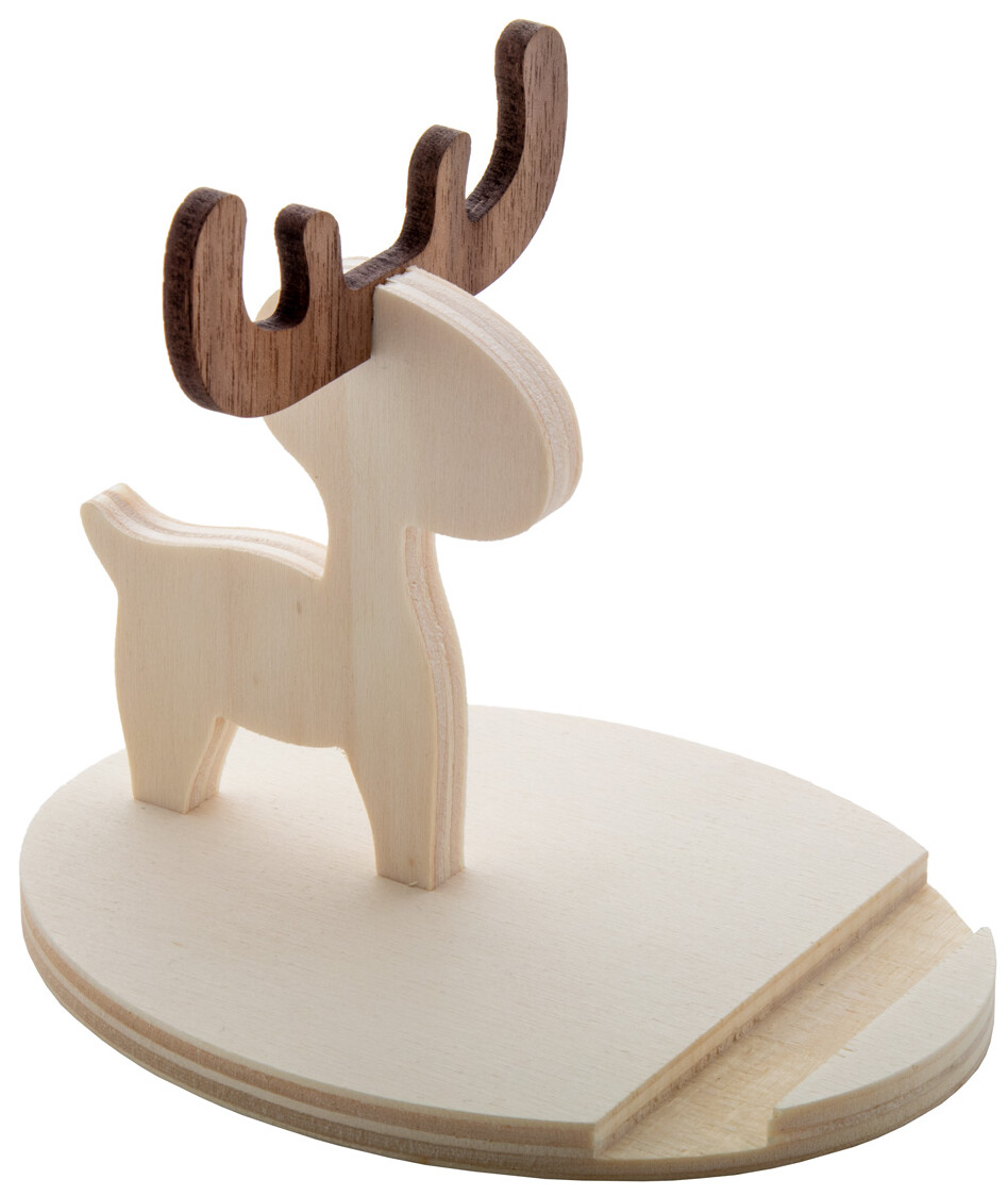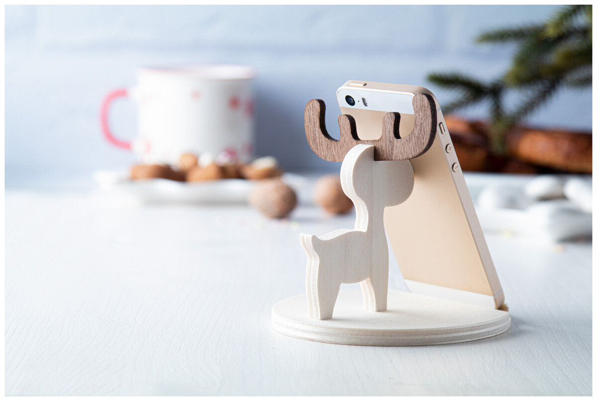 Stojánek na mobil z březové překližky ve tvaru soba. Dodáváno rozložené.