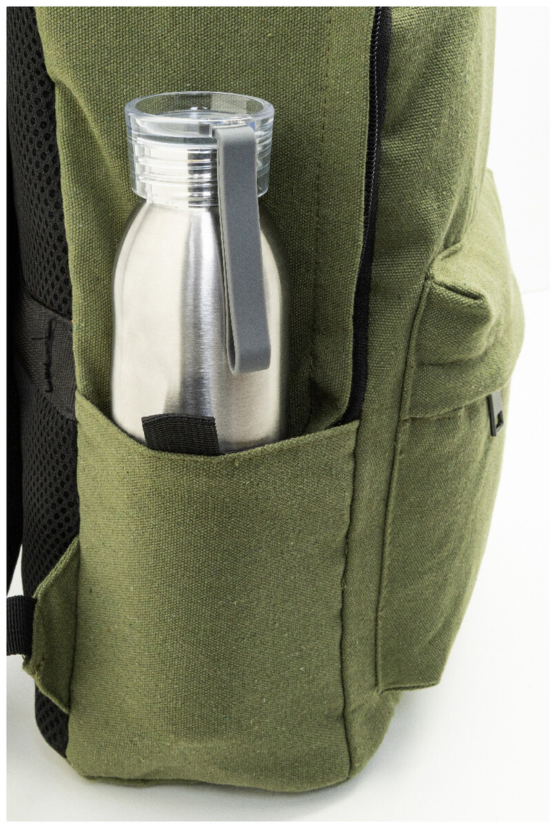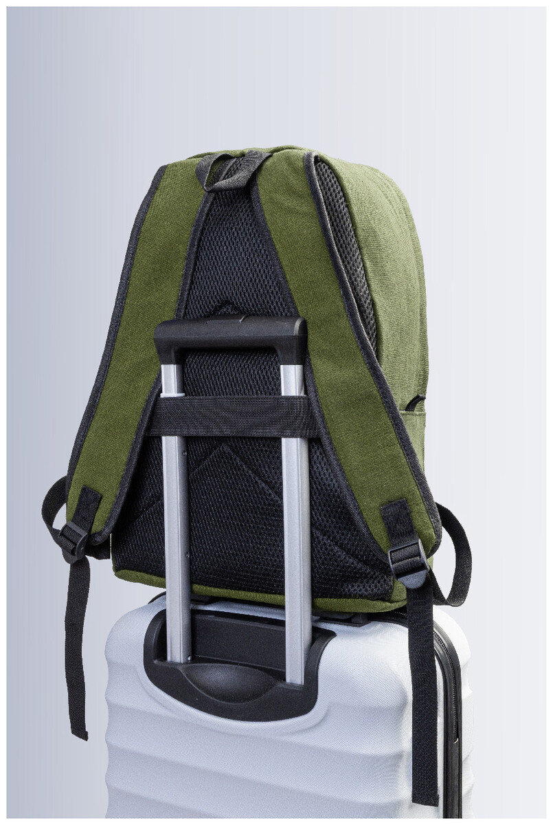 Recyklovaný plátěný batoh s hlavní přihrádkou na zip, polstrovanou přihrádkou na notebook (15"), 2 předními kapsami na zip, bočními kapsami, popruhem na kolečkách, polstrovanými zády a ramenními popruhy. 70% recyklované bavlny a 30% RPET polyesteru. S výrazným štítkem recyklované bavlny.
