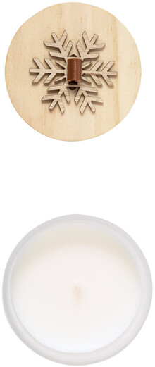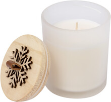 Vosková svíčka s vůní vanilky ve skleněném svícnu s dřevěným víčkem s ozdobou sněhových vloček.