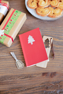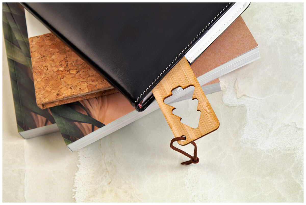 Bambusová záložka do knihy s vyřezaným vánočním motivem a poutkem z PU kůže.