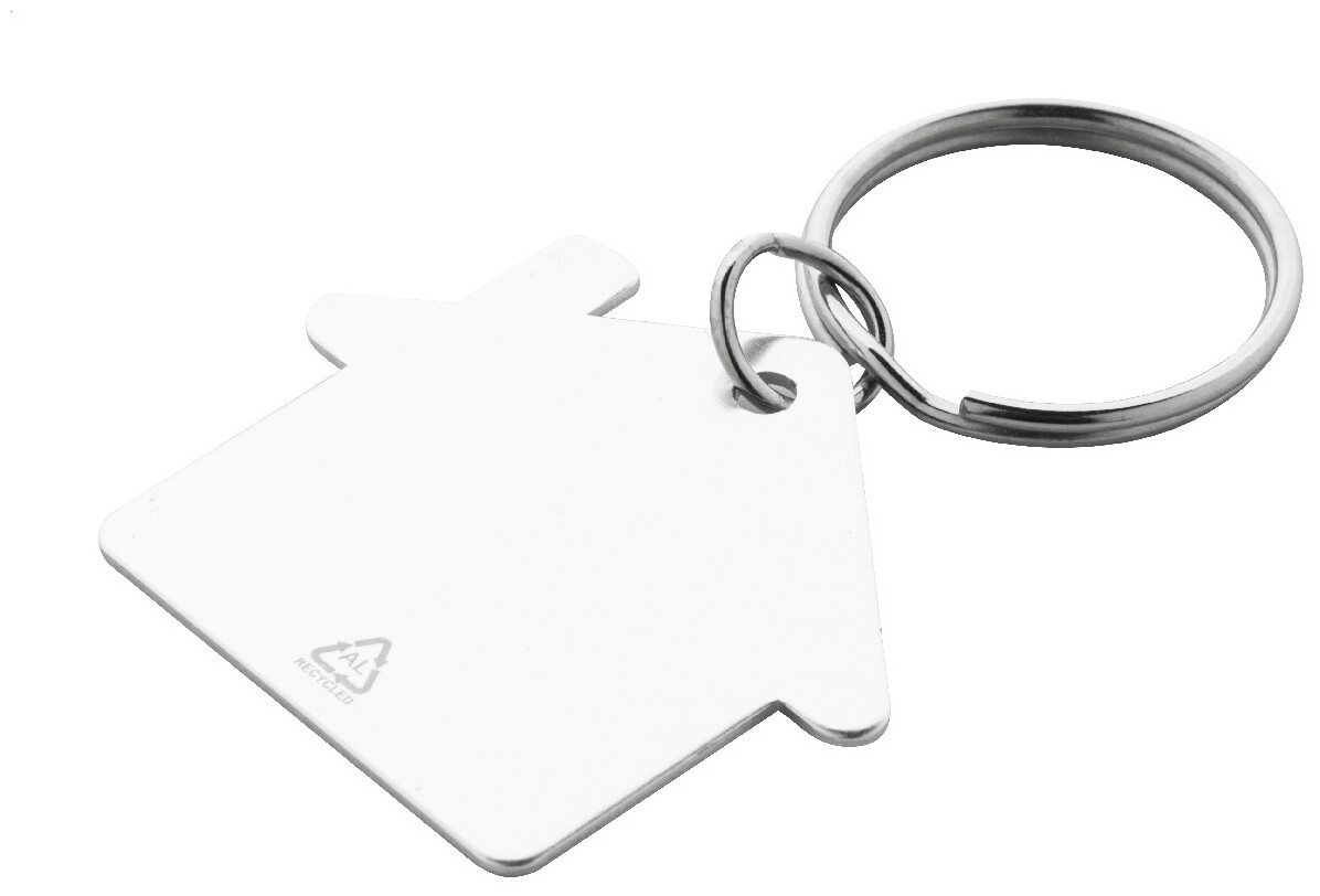 Přívěšek na klíče ve tvaru domečku z recyklovaného hliníku s kovovým kroužkem.