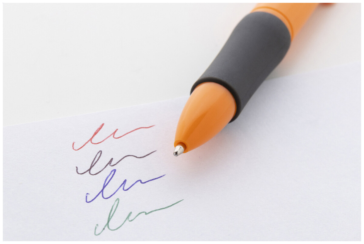 Vícebarevné kuličkové pero z recyklovaného ABS materiálu s gumovým úchopem. S černou, modrou, červenou a zelenou náplní.
