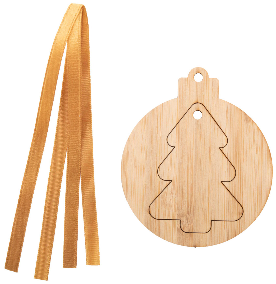 Vánoční ozdoba 2v1 z bambusové překližky se zlatou stuhou. Dodáváno s oddělenou stuhou.