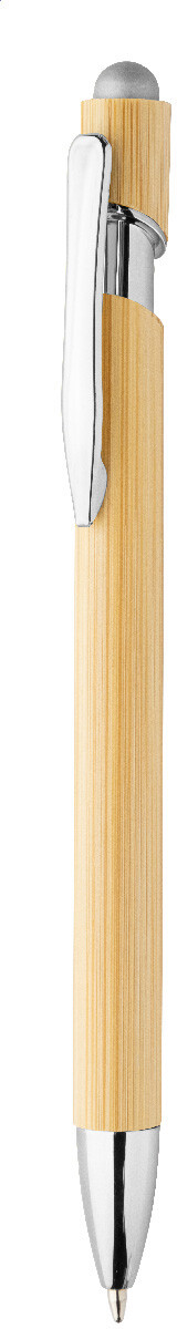 Bambusové dotykové kuličkové pero s lesklými kovovými detaily a barevným dotykovým stylusem. S modrou náplní.