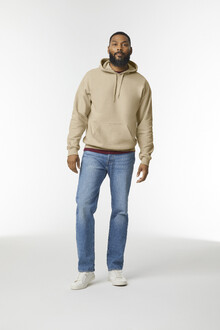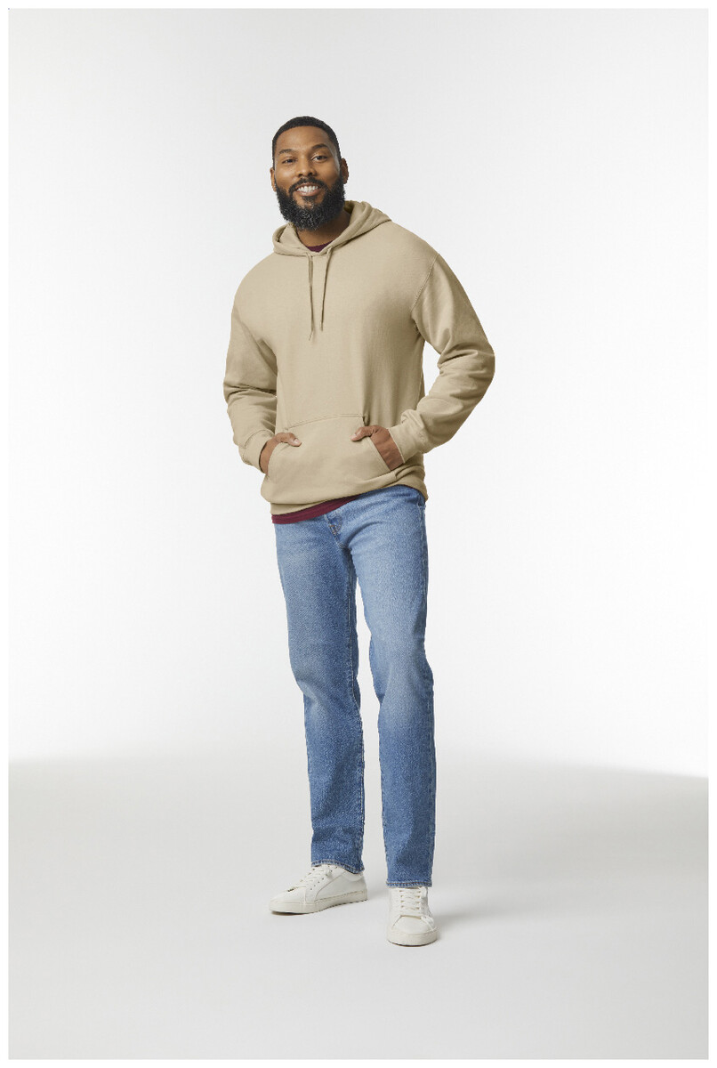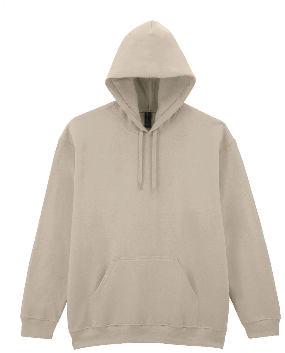 Mikina s kapucí, 80% bavlna a 20% polyester s přední kapsou. 285 g/m2 (bílá 278 g/m2). Značka Gildan.