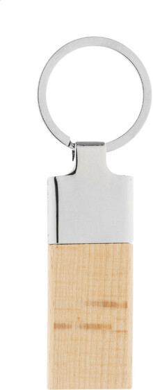 Přívěšek na klíče ve tvaru obdélníku z kovu a bukového dřeva s kovovým kroužkem.