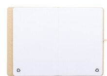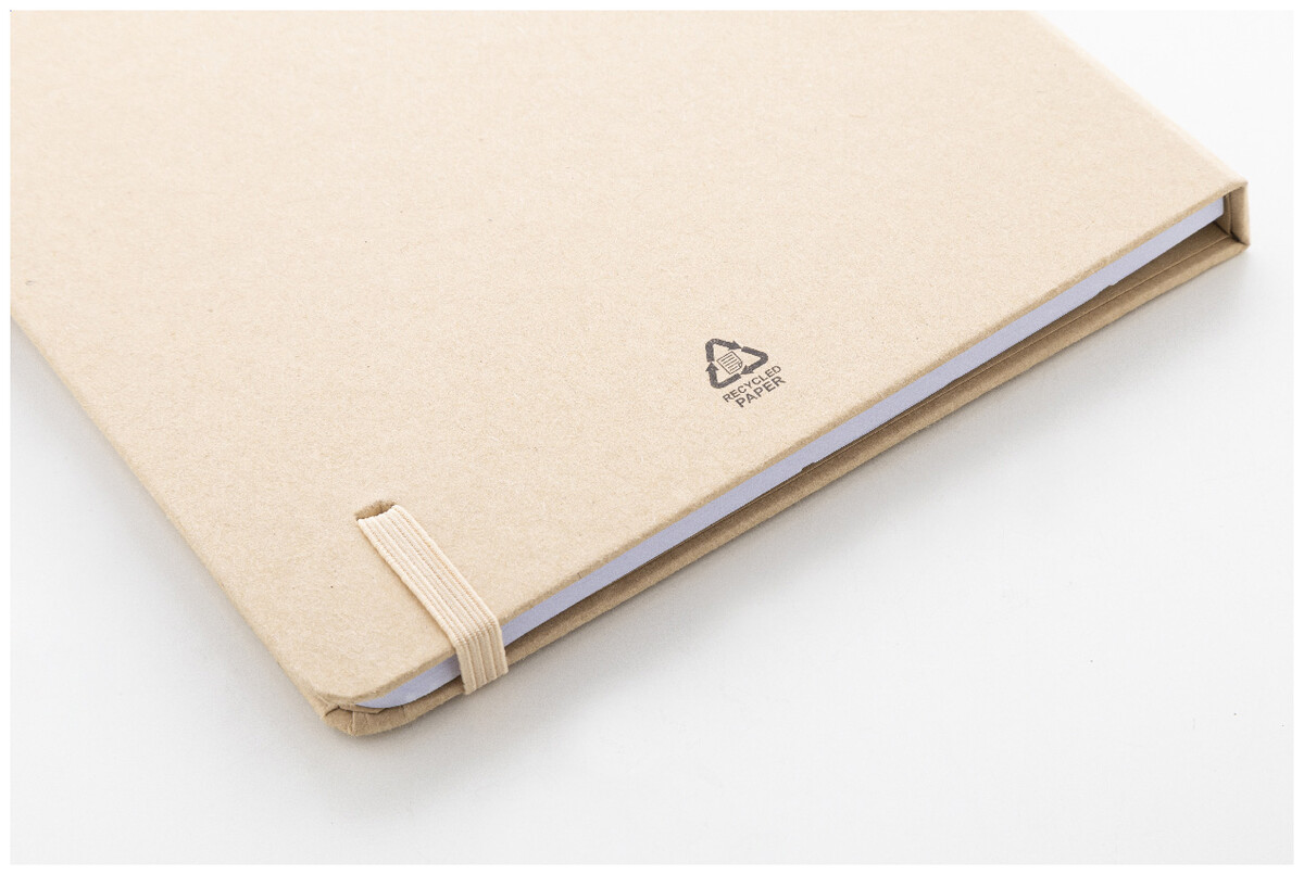 Blok A5 z recyklovaného kartonu s 70 prázdnými listy z recyklovaného papíru. Vnitřní obal obsahuje 25 samolepících papírků, 125 značkovačů stránek a kapsu na vizitky. S gumovým popruhem a držákem na pero.
