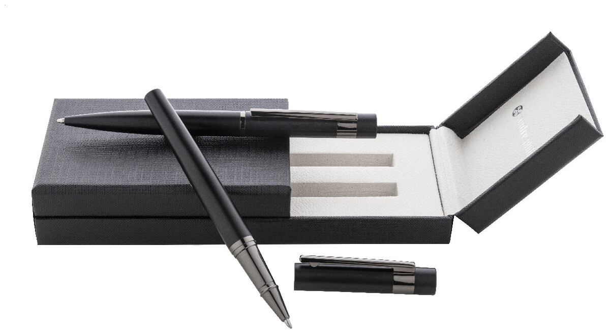 Elegantní sada kovového kuličkového pera a rolleru s lesklými detaily v barvě antracit. V barevně sladěné dárkové krabičce a s modrou náplní. Produkt značky André Philippe.