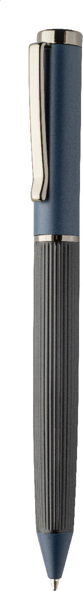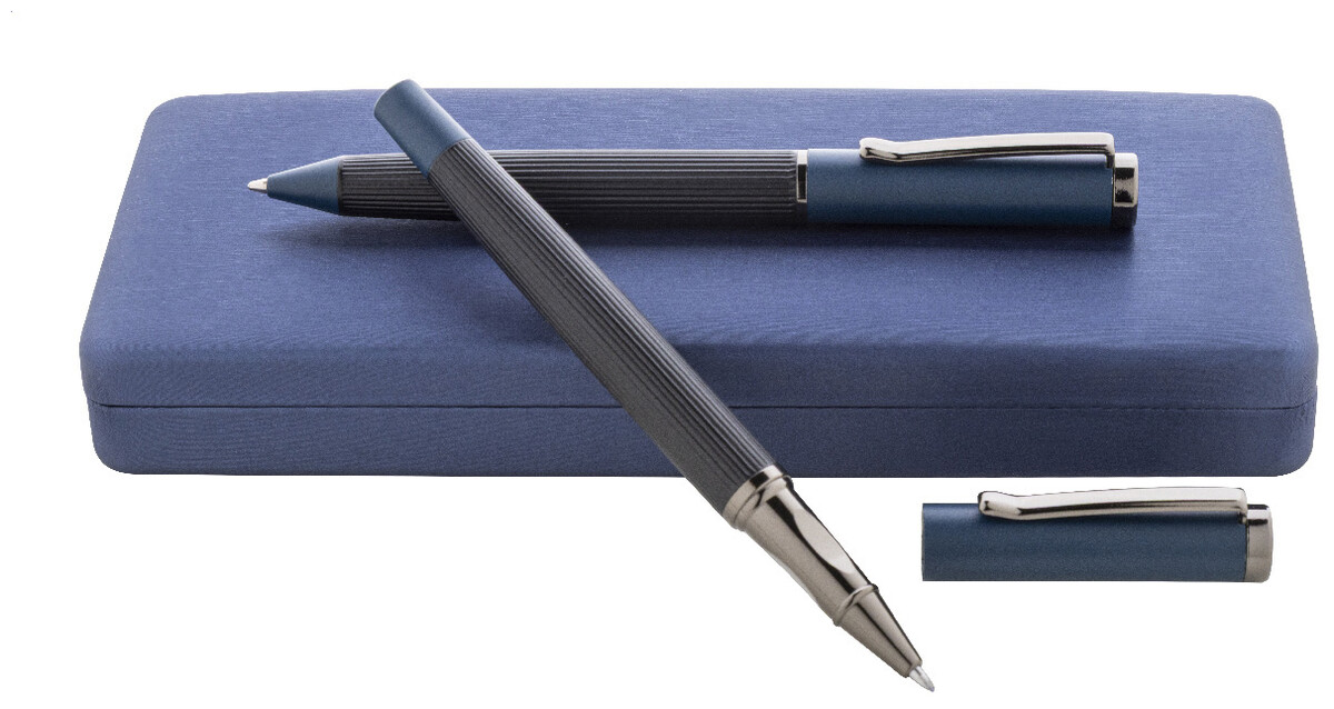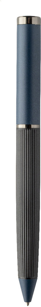 Elegantní sada kovového kuličkového pera a rolleru s pruhovaným tělem, barevnými akcenty a lesklými detaily v barvě antracit. V barevně sladěné dárkové krabičce a s modrou náplní. Produkt značky André Philippe.