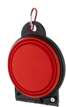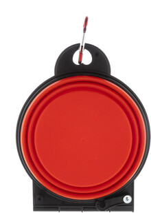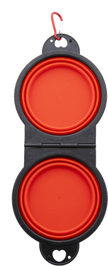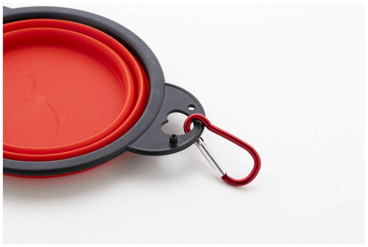 Skládací miska pro domácí mazlíčky z odolného TPE se dvěma přihrádkami o objemu 450 ml a barevně sladěnou hliníkovou karabinou.