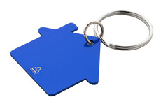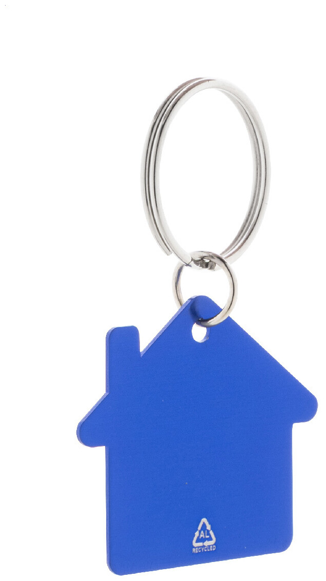 Přívěšek na klíče ve tvaru domečku z recyklovaného hliníku s kovovým kroužkem.