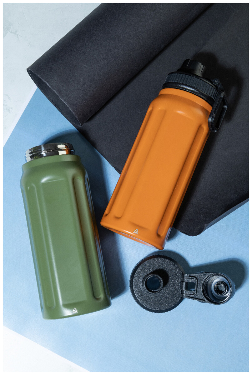Dvoustěnná termoska z recyklované nerezové oceli s vertikálními drážkami. S víčkem z polypropylenu a s integrovaným držadlem. 540 ml.