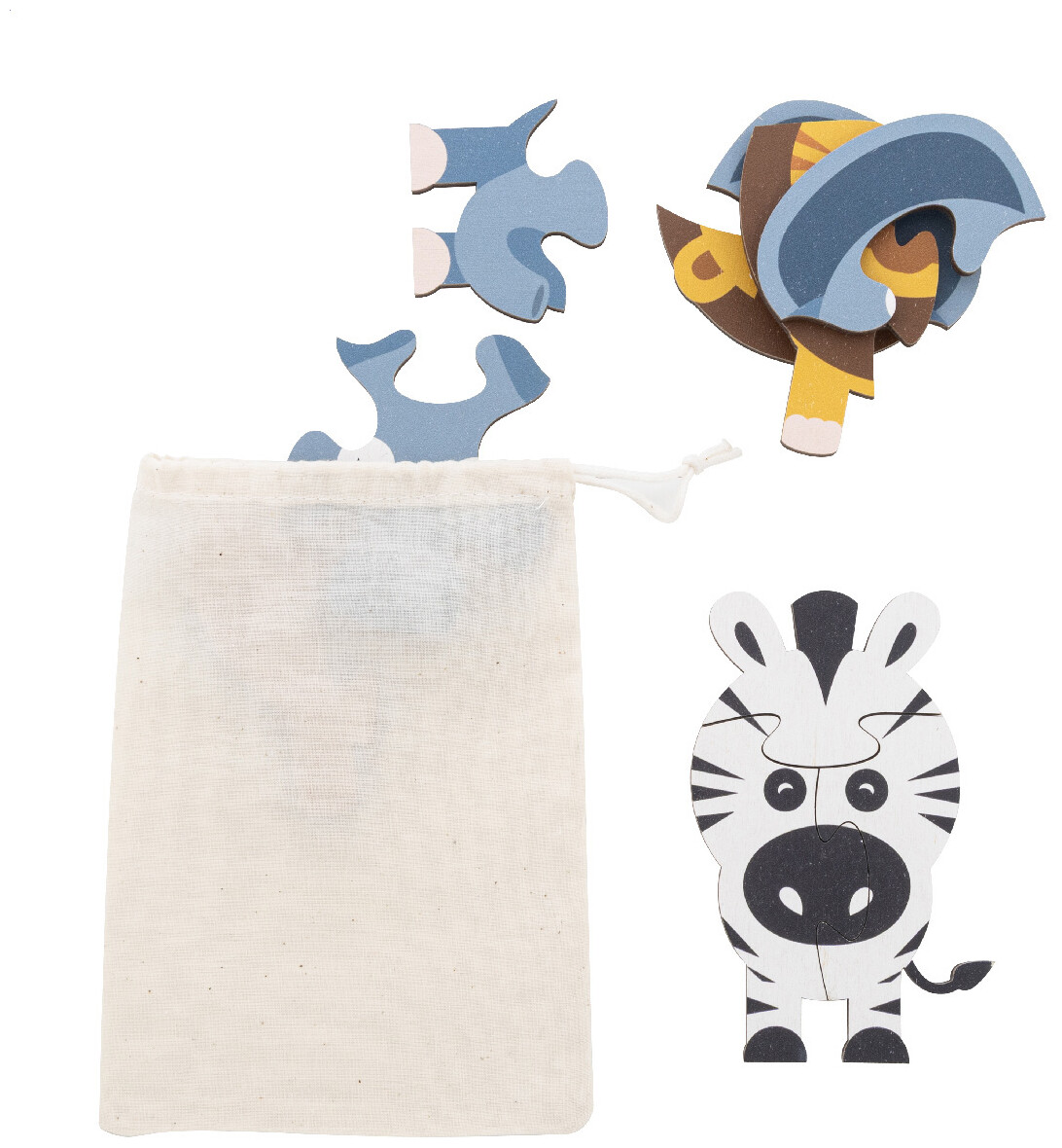 Dětská sada puzzle z březové překližky se 3 tematickými motivy. V bavlněném přepravním pytlíku.